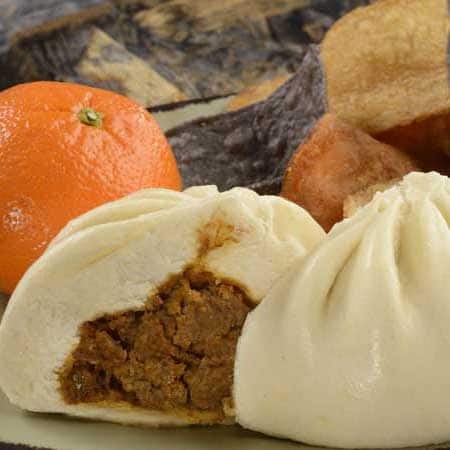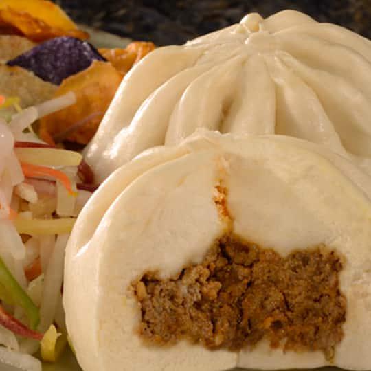 Steamed Cheeseburger Pod stuffed with Ground Beef, Ketchup, Mustard, Pickle, and Cheddar Cheese served with Crunchy Vegetable Slaw and Vegetable Chips