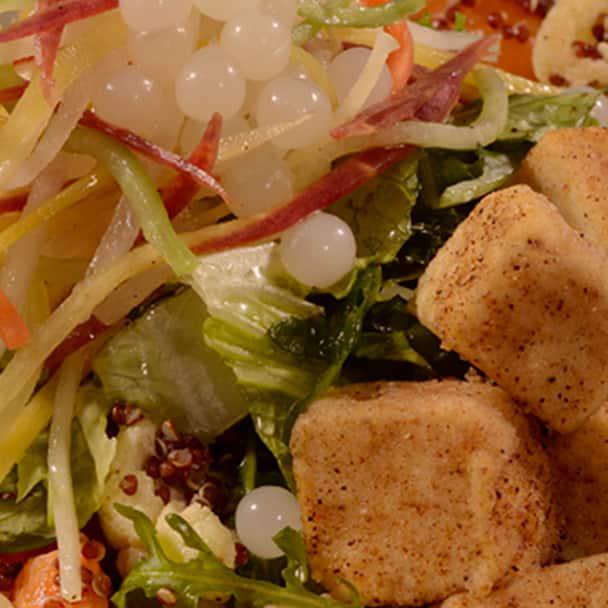 Crispy Fried Tofu seasoned with Chili-Spice topped with Crunchy Vegetable Slaw and Boba Balls served with your choice of Base and Sauce