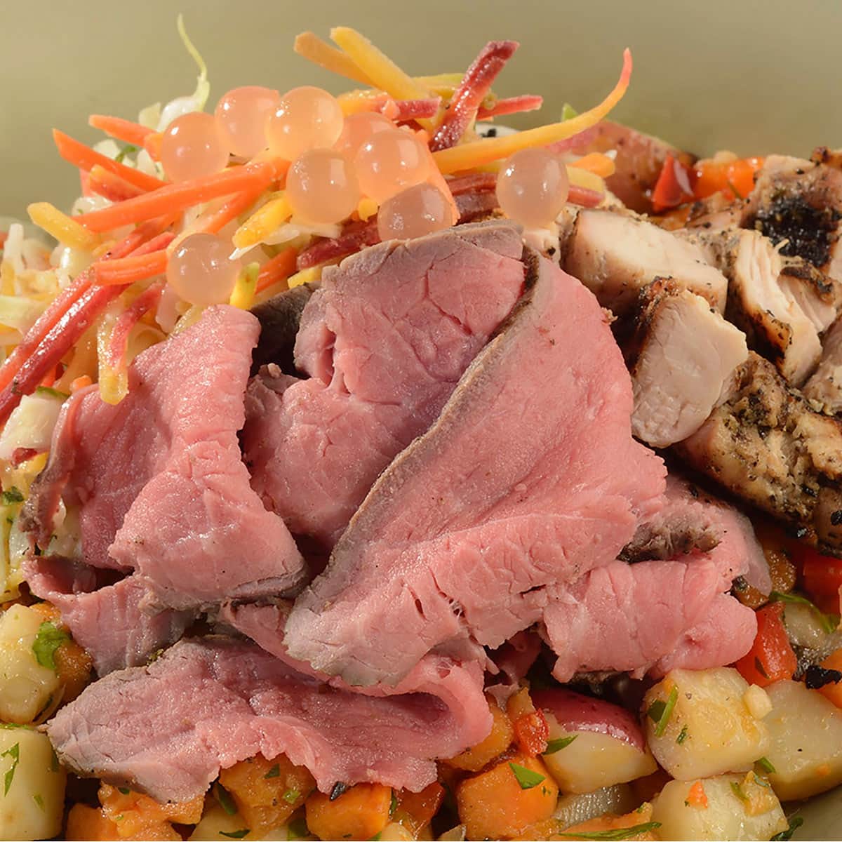 Slow-roasted Sliced Grilled Beef marinated in a blend of Garlic, Herbs, Red Pepper Spice, and Red Wine Vinegar paired with Wood-grilled Chicken Thighs marinated in Garlic and Olive Oil topped with Crunchy Vegetable Slaw and Boba Balls served with your choice of Base and Sauce. *This item contains raw or undercooked ingredients. Consuming raw or undercooked meats, seafood, shellfish, or eggs may increase your risk of foodborne illness.