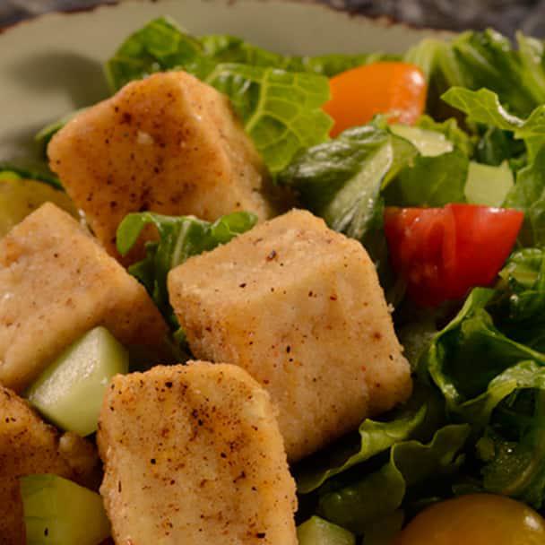 Crispy Fried Tofu seasoned with Chili-Spice topped with Crunchy Vegetable Slaw served with your choice of Base and Sauce