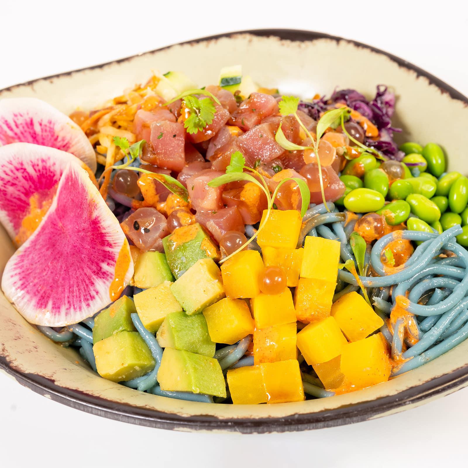 Blue Noodles, Tuna, Watermelon Radish, Pickled Daikon, Rainbow Carrots, Avocado, Cucumbers, and Red Cabbage with Miso and Sweet Soy Drizzle topped with Micro Cilantro. *This item contains raw or undercooked ingredients. Consuming raw or undercooked meats, poultry, seafood, shellfish, or eggs may increase your risk of foodborne illness.