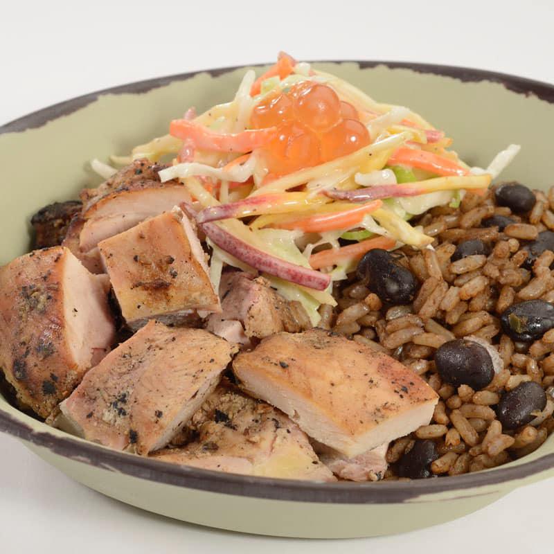 Wood-Grilled Chicken Thighs marinated with Garlic and Olive Oil topped with Crunchy Vegetable Slaw and Boba Balls served with your choice of Base and Sauce