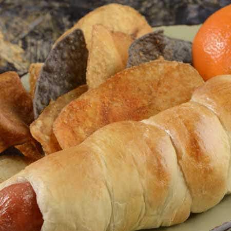 All-Beef Hot Dog wrapped in a Parker House Dough served with Vegetable Chips and a Cuties® Mandarin with Small DASANI® Bottled Water or Lowfat Milk