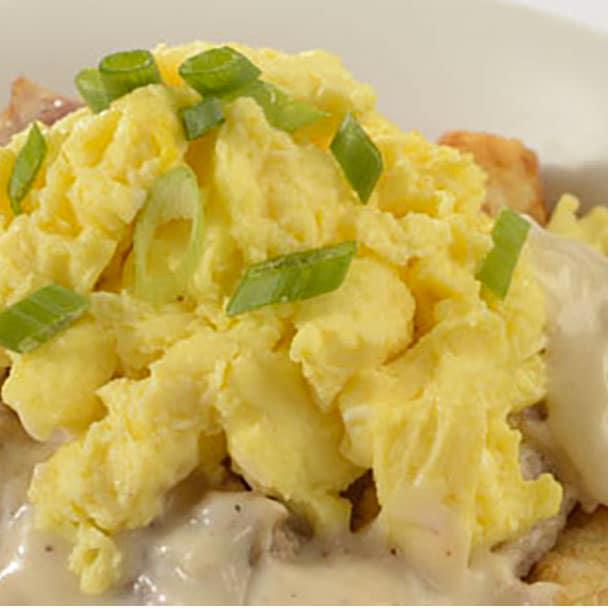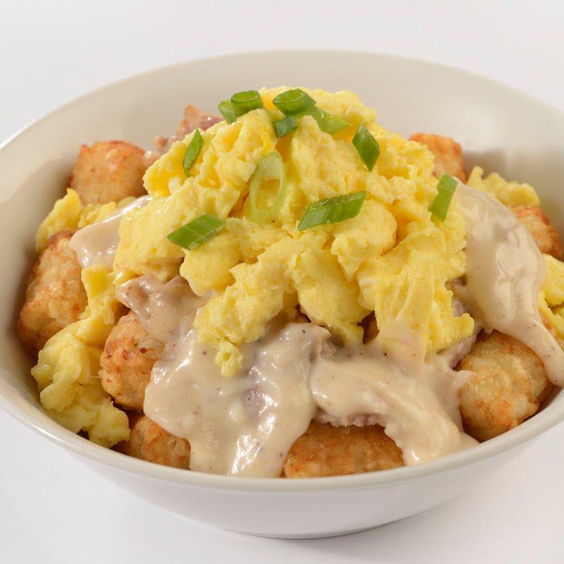 Hearty portion of Potato Barrels smothered in Smoked Brisket Country Gravy, Scrambled Eggs and a sprinkling of Green Onions