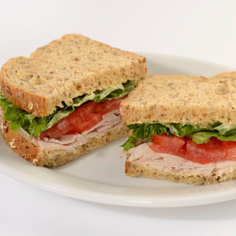 Thick-sliced Smoked Turkey Breast, Lettuce, and Tomato served chilled on Sunflower Multigrain Bread