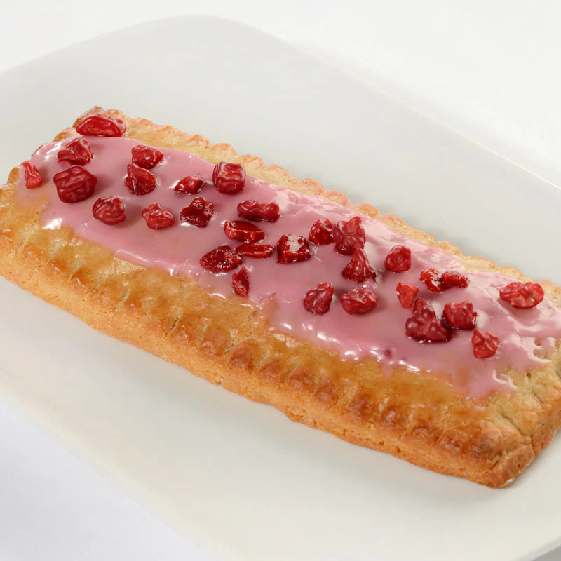 Raspberry Marmalade stuffed Pastry coated in a Strawberry Fondant and Crispy Pearls