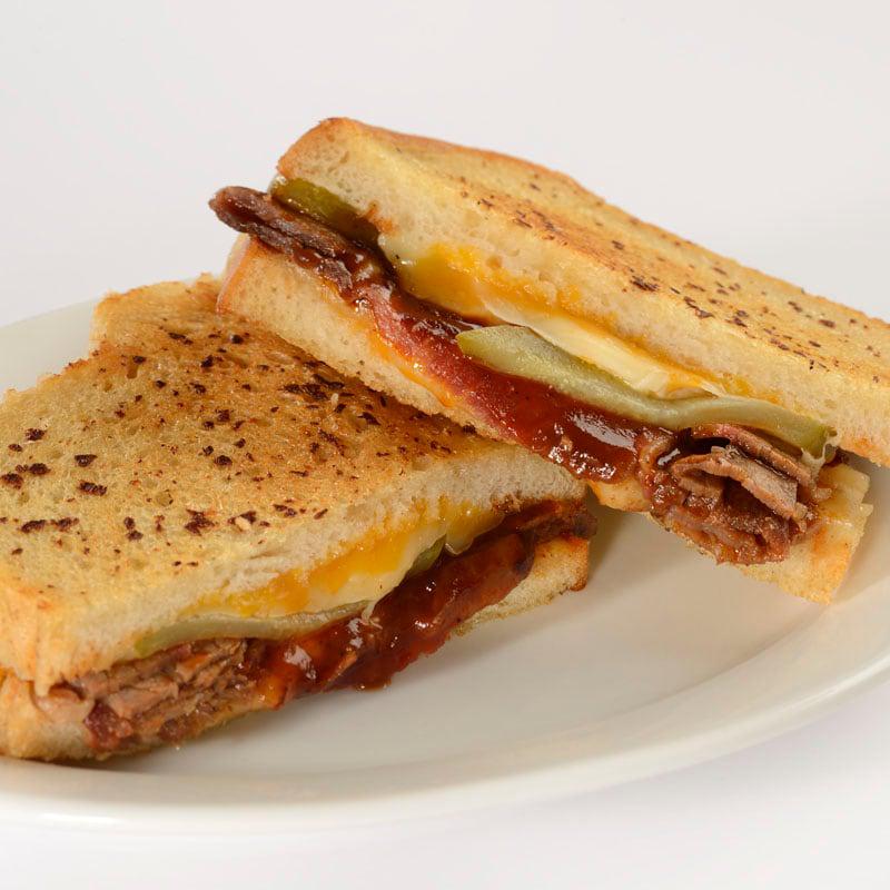 Shredded Smoked Brisket, Pickles, and Tangy Barbecue Sauce between Melted Cheddar and Monterey Jack on Grilled Sourdough Bread