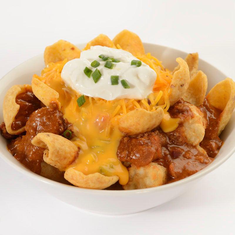 "Chili", "Cheese", Green Onions, and Corn Chips served over Potato Barrels