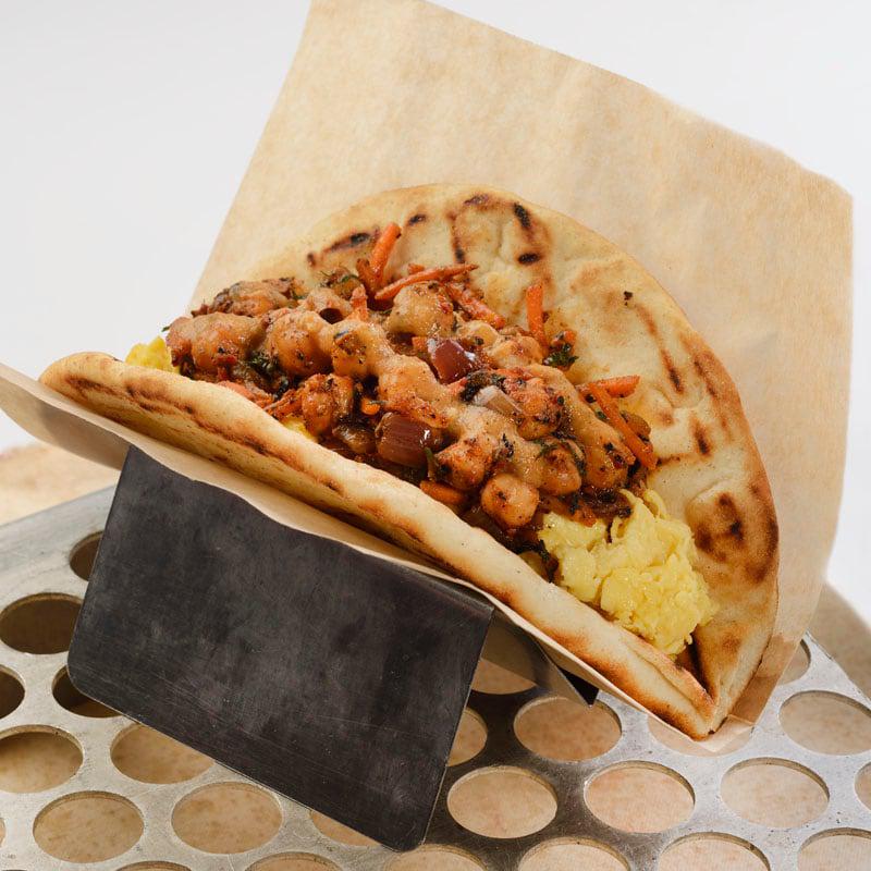 Plant-based Egg, Smoky Chickpea-Onion Slaw, and Roasted Tomato Sauce wrapped in Pita Bread