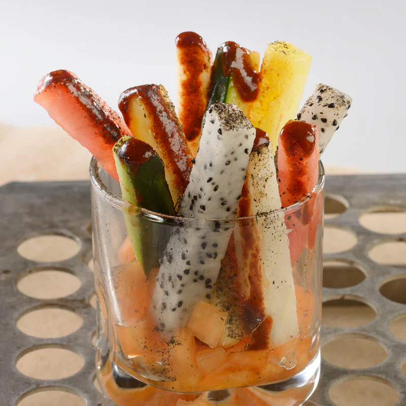 Sticks of Jicama, Cucumber, Pineapple, Melon and Dragon Fruit doused in a Tamarind Sauce and dusted with Peppercorn Ash (Plant-Based)