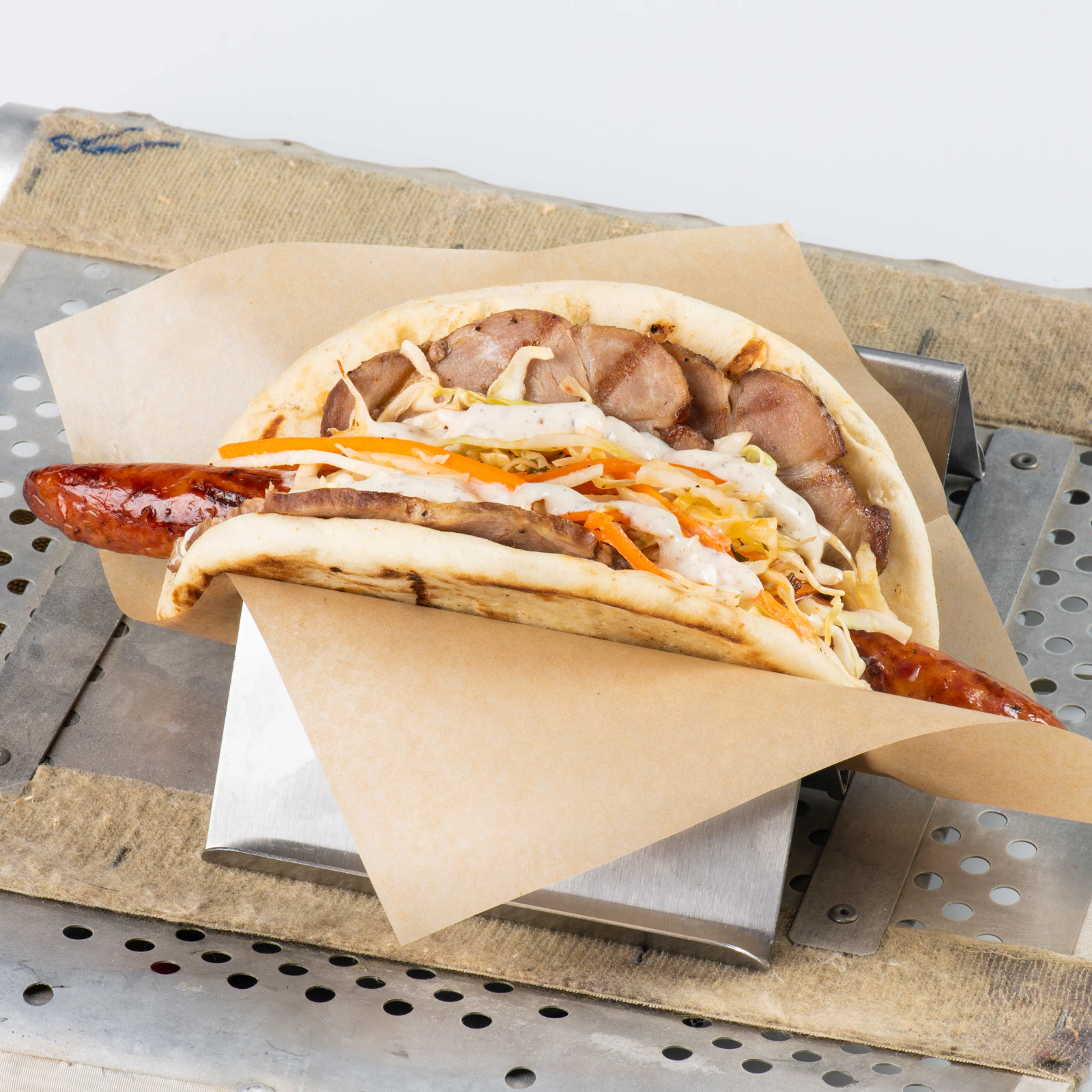 Roasted Pork, Grilled Pork Sausage, Peppercorn Sauce, and Tangy Slaw wrapped in Pita Bread