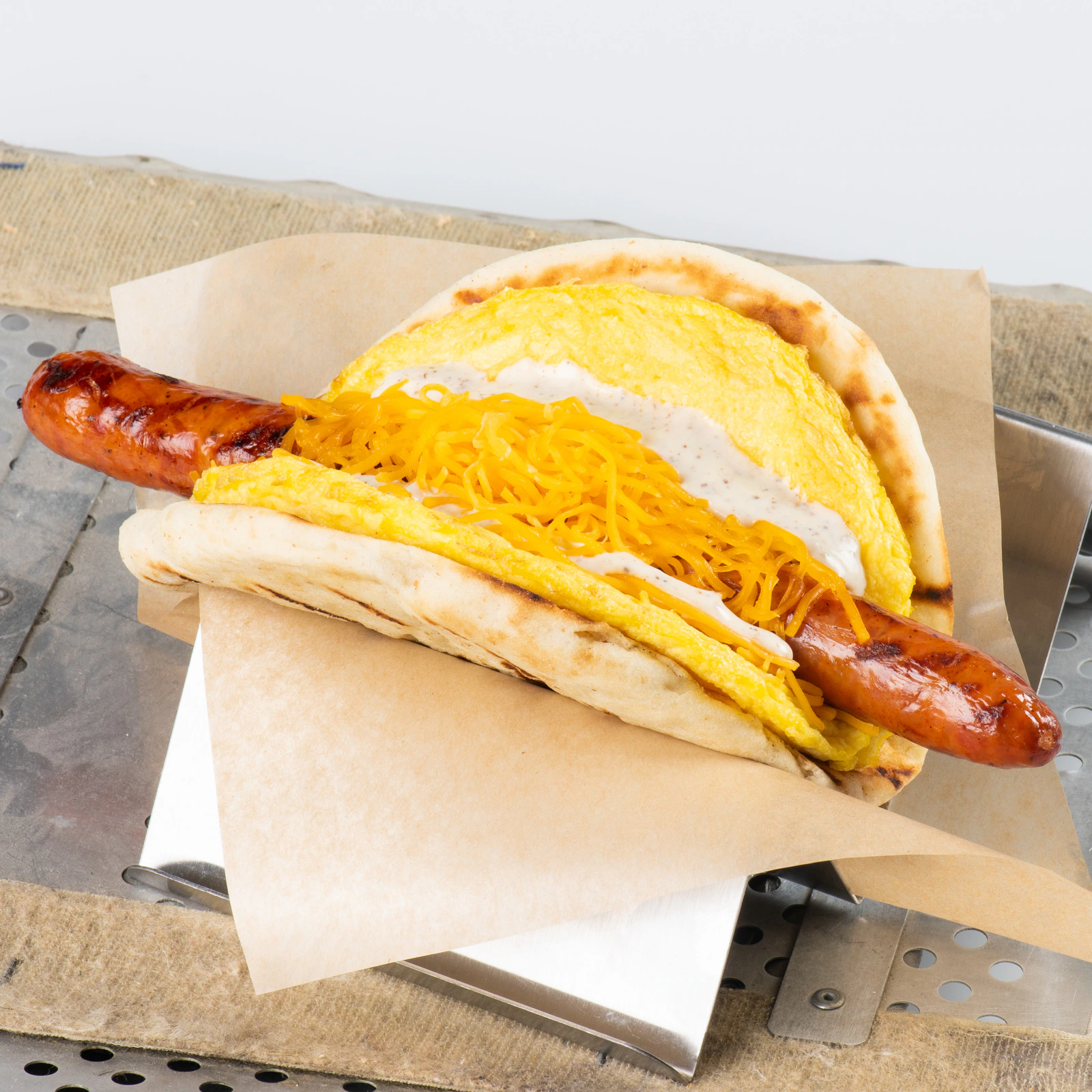Eggs, Grilled Pork Sausage, Shredded Cheddar, and Peppercorn Sauce in Pita Bread