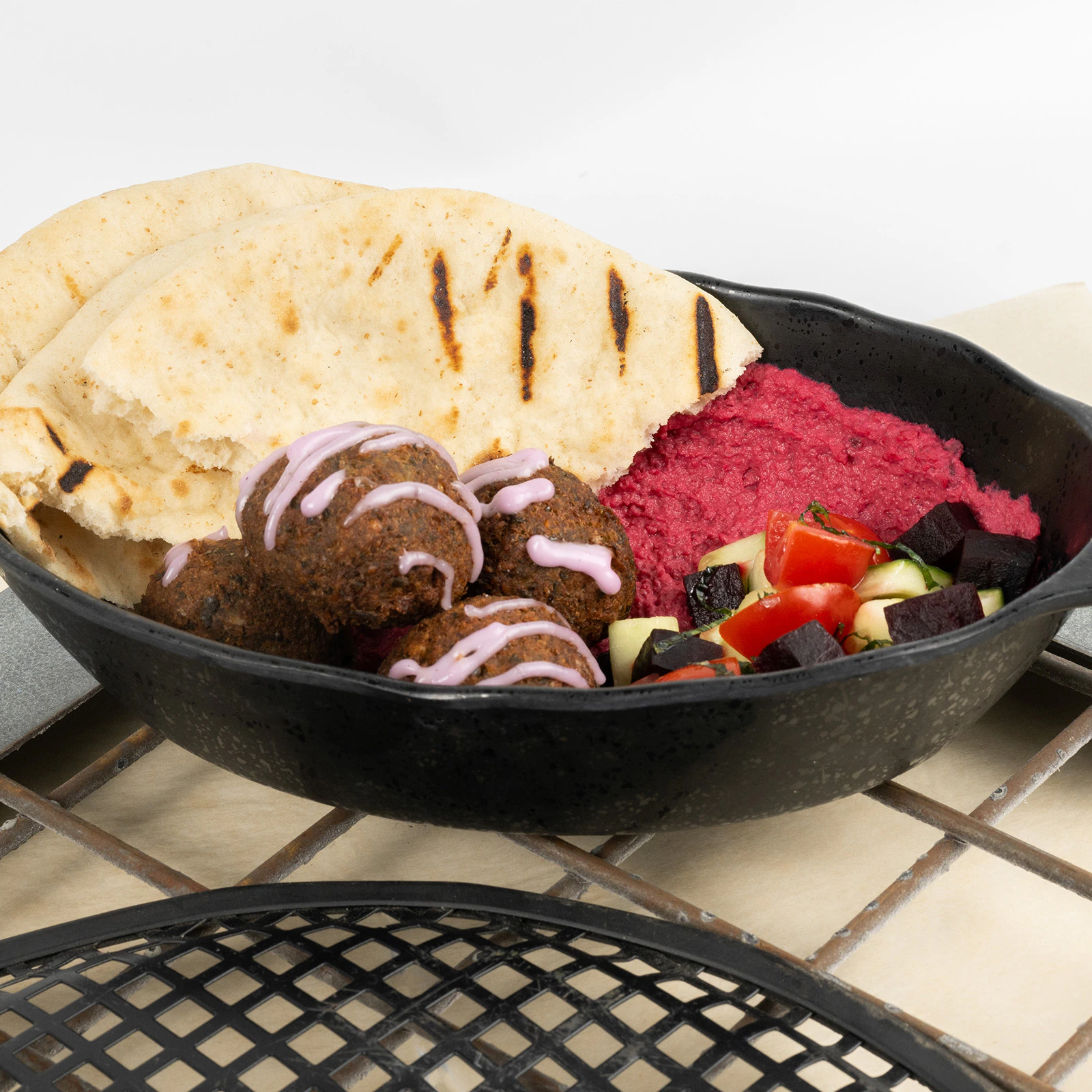 Chickpea Falafel, Roasted Beet Hummus, and Beet-Tomato-Cucumber Relish topped with Garlic Toum Sauce and served with Grilled Pita