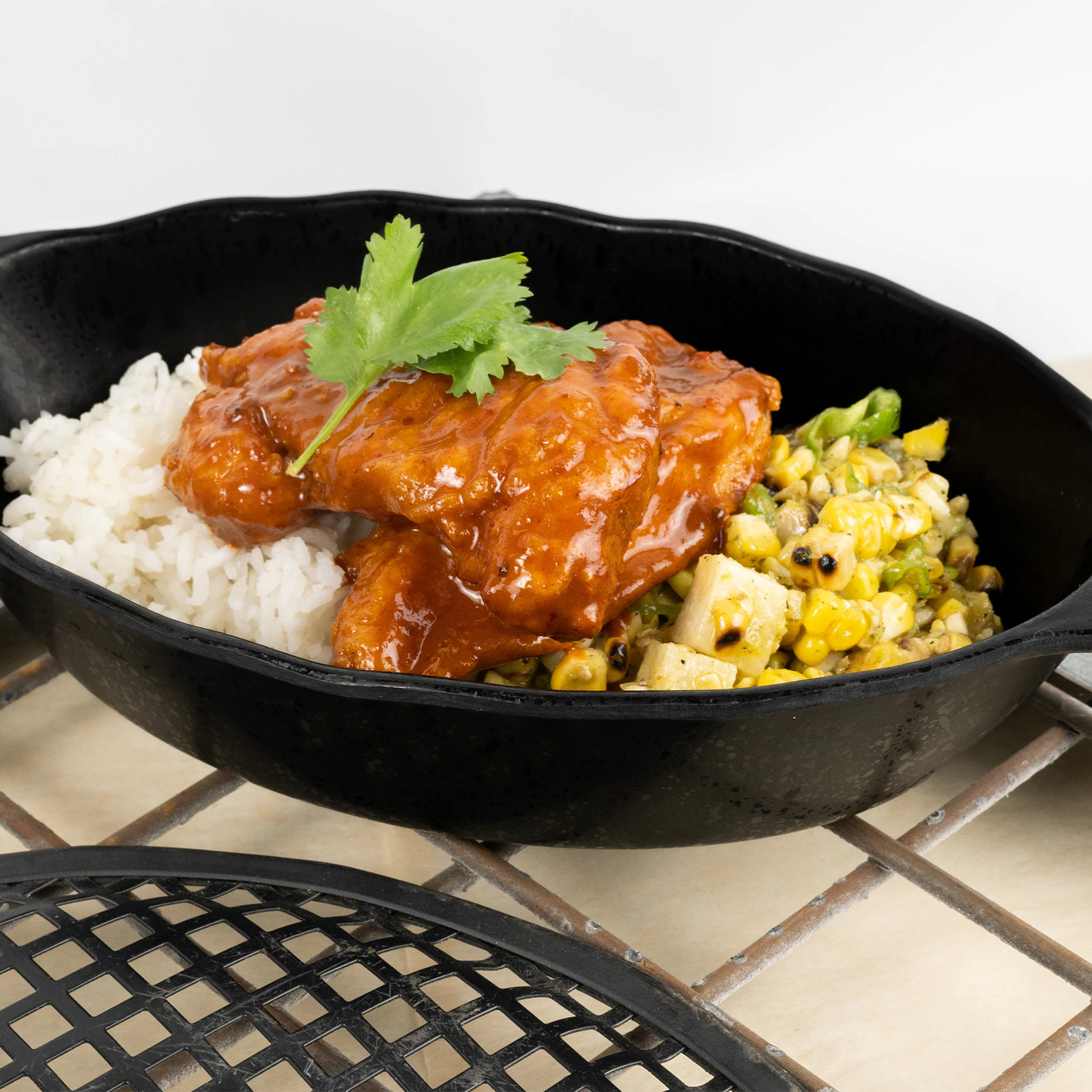 Crispy Chicken glazed in a Spicy Chipotle Sauce and served with White Rice and a Relish of Sweet Corn, Shishito Peppers, Jicama, Plantains, and Cilantro