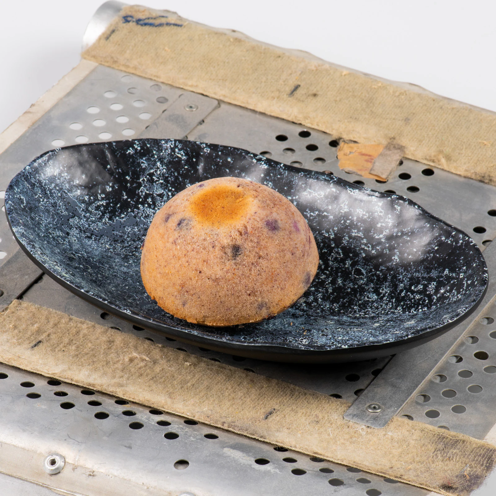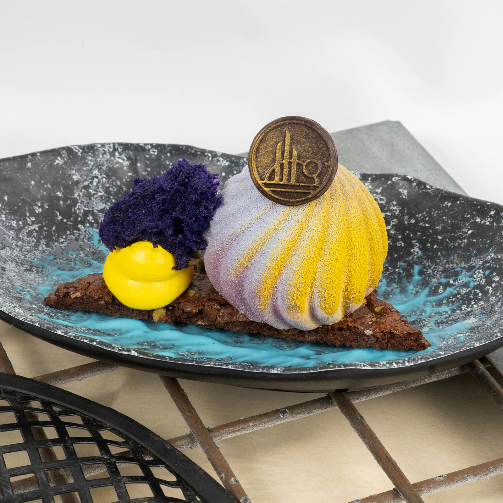 White Chocolate Jogan Fruit Mousse atop a Brownie Brittle served with Blue Milk Sauce, Pineapple Cream, and Hibiscus Sponge topped with a Chocolate Black Spire Coin