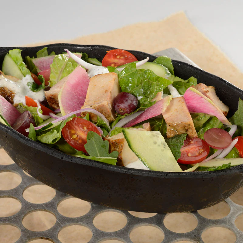 Marinated Chicken, Mixed Greens, Shaved Onion and Radish, Grapes, Tomato, and Cucumber in a Citrus-Pomegranate Vinaigrette with Spiced Yogurt Drizzle