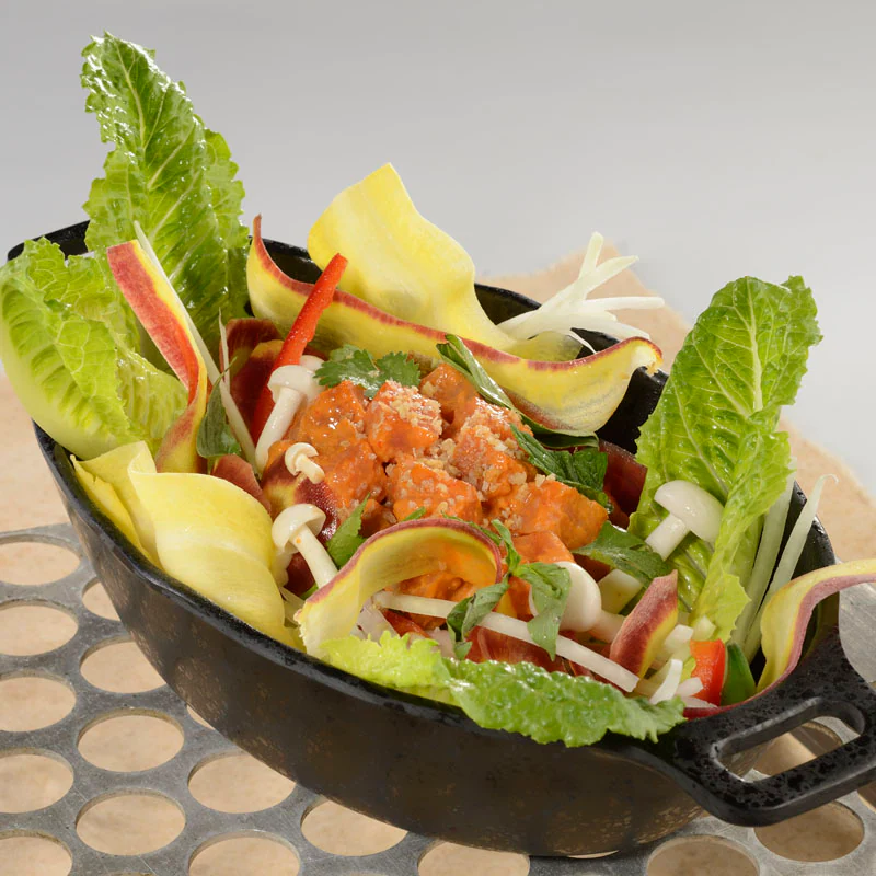 Raw Tuna tossed in a Spicy Sriracha Dressing and served with Green Papaya Salad, Pickled Mushrooms, Fresh Herbs, and Crispy Garlic