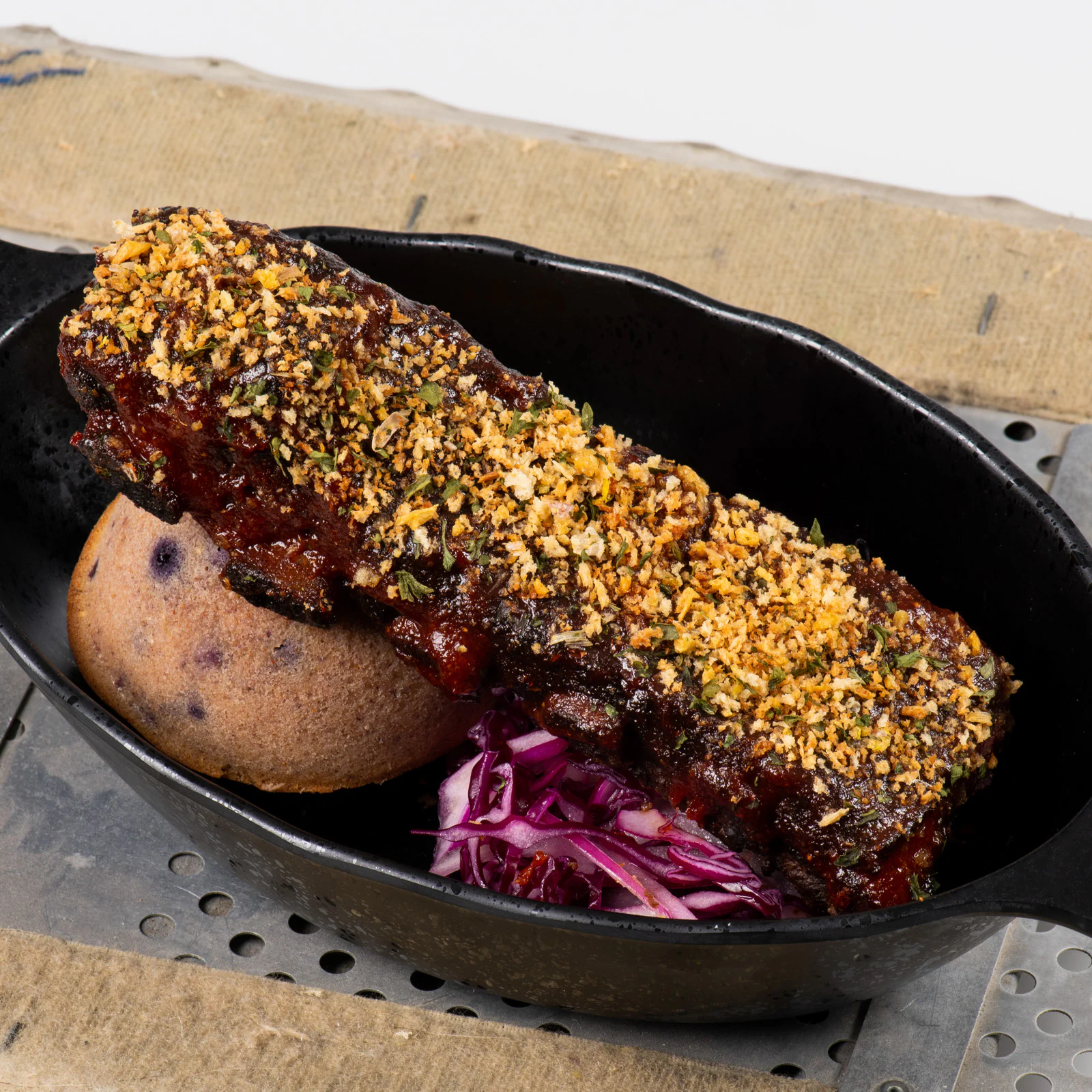 Pork Ribs brushed with Tangy BBQ Sauce and served with Blueberry Corn Muffin and Red Cabbage Slaw